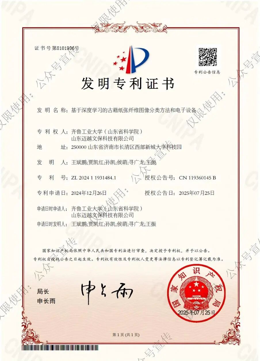 齐鲁工业大学电子电气与控制学部孙凯教授团队,主要研究方向包括智能感知技术、深度学习神经网络及工业大数据。近年来,团队承担国家级、省部级课题10余项,横向课题多项,在IEEE Transactions系列等顶级期刊发表SCI论文20余篇,授权发明专利10余项。其深厚的学术积累与丰富的实践经验为本次合作提供了坚实支撑。 传统纸张纤维识别主要利用显微成像技术将纸张纤维放大,再通过人工经验判断,存在效率低、准确性不足的问题,难以应对海量古籍保护需求。针对这一技术瓶颈,联合团队创新性地将深度学习技术应用于古籍纸张纤维图像分类领域。通过大量实验与数据优化,团队成功构建高精度图像分类模型。该模型能够快速、精准识别古籍纸张纤维类型,显著提升了分析效率与准确性。基于此技术开发的电子设备操作简便,可广泛应用于文物保护现场、图书馆等场所,为古籍修复与保存提供科学依据。 此次专利授权是双方合作历程中的重要里程碑。在济南市科技副总政策支持下,孙凯教授与山东迈越文保科技有限公司在脱酸设备智能化改造、古籍纸张纤维图像识别软件开发、科研课题申报及人才联合培养等方面紧密合作,成果丰硕。 未来,双方将进一步深化合作,围绕古籍保护领域的关键技术难题展开联合攻关:一是优化基于深度学习的古籍纸张纤维图像分类技术,拓展其在古籍年代鉴定、版本识别等场景的应用;二是加速科研成果转化,推动更多先进技术与设备投入实际应用,为传承中华优秀传统文化贡献力量。