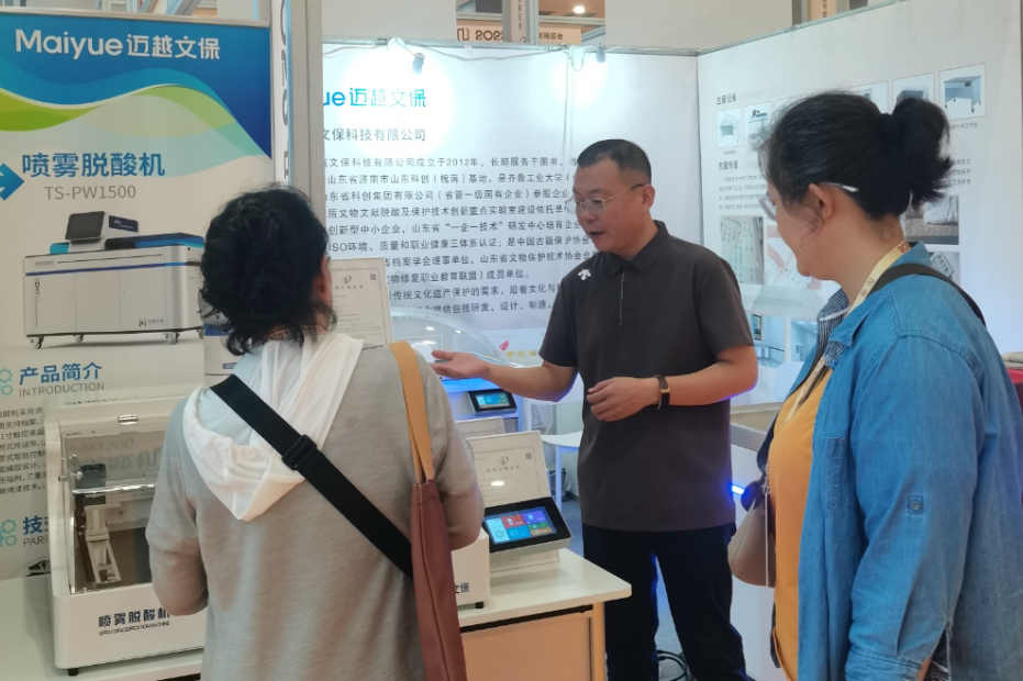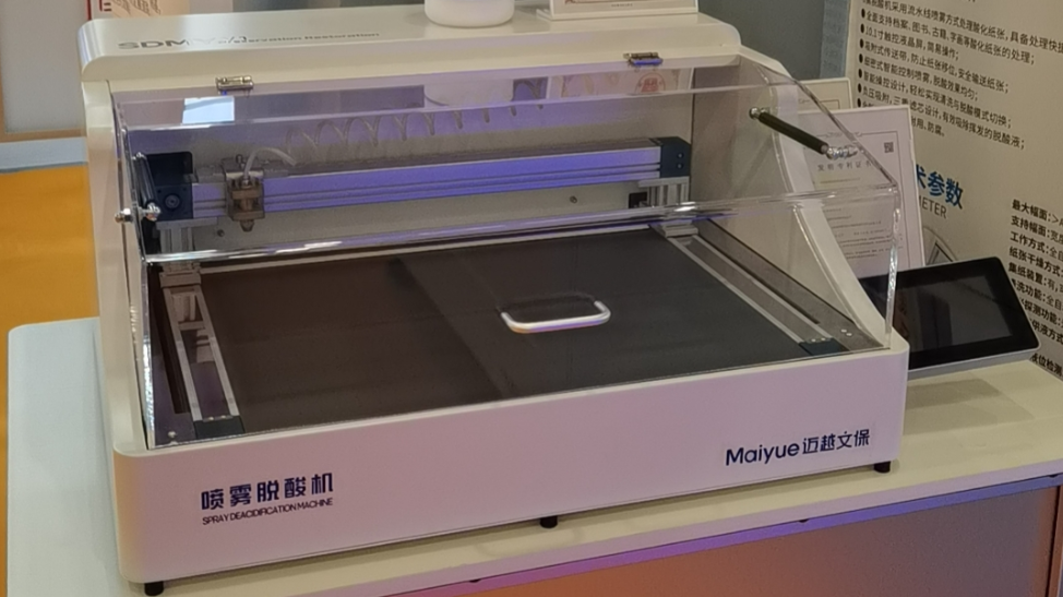 展会期间,我们展示了能够快速修补破损古籍的纸浆修补机,引发了广泛的咨询和关注。 虫蛀的古籍通过纸浆修补机重获新生。纸浆修补机利用纸浆纤维填充破损区域,辅助修复人员实现高质量快速修补。修补后的古籍增加了纸张强度,能够正常翻阅,有利于长久保存。 同时,迈越文保发布了桌面式喷雾脱酸机、除尘除霉工作台两款全新产品,助力科技赋能古籍保护事业。 其中,桌面式喷雾脱酸机具有体积小,实用性高的特点,能够实现酸化古籍的快速脱酸,以无水脱酸技术助力实现古籍的长久保存。 除尘除霉工作台适合开展除尘除霉、清洗、展平修复等古籍修复工作。高透隔离罩,放心修复污损古籍,操作无忧。有效清理和滤除灰尘、霉菌、细菌等有害物质。