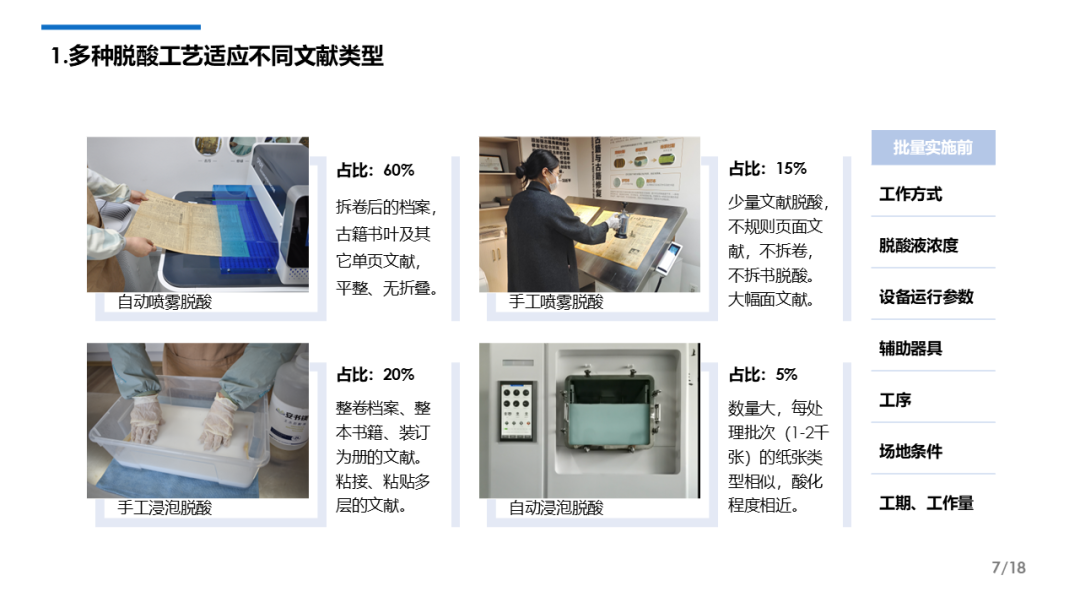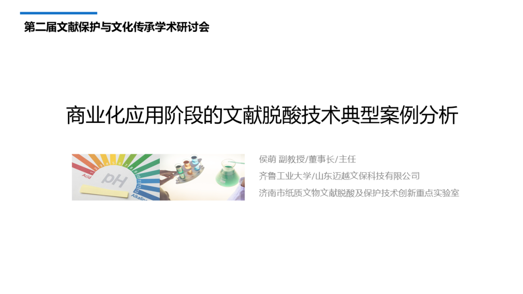 齐鲁工业大学副教授、山东迈越文保科技有限公司董事长侯萌先生做《商业化应用阶段的文献脱酸技术典型案例分析》大会特邀报告,介绍了迈越文保无水脱酸技术的十年发展历程和规模化商用现状,介绍了多种脱酸工艺适应不同文献类型、与修复方法结合实现综合保护、脱酸质量要求和质检方法,以及脱酸效果长期验证四个实施要点,然后分享了报纸、古籍、档案和字画四类文献脱酸特点、难点及解决方法的典型案例。